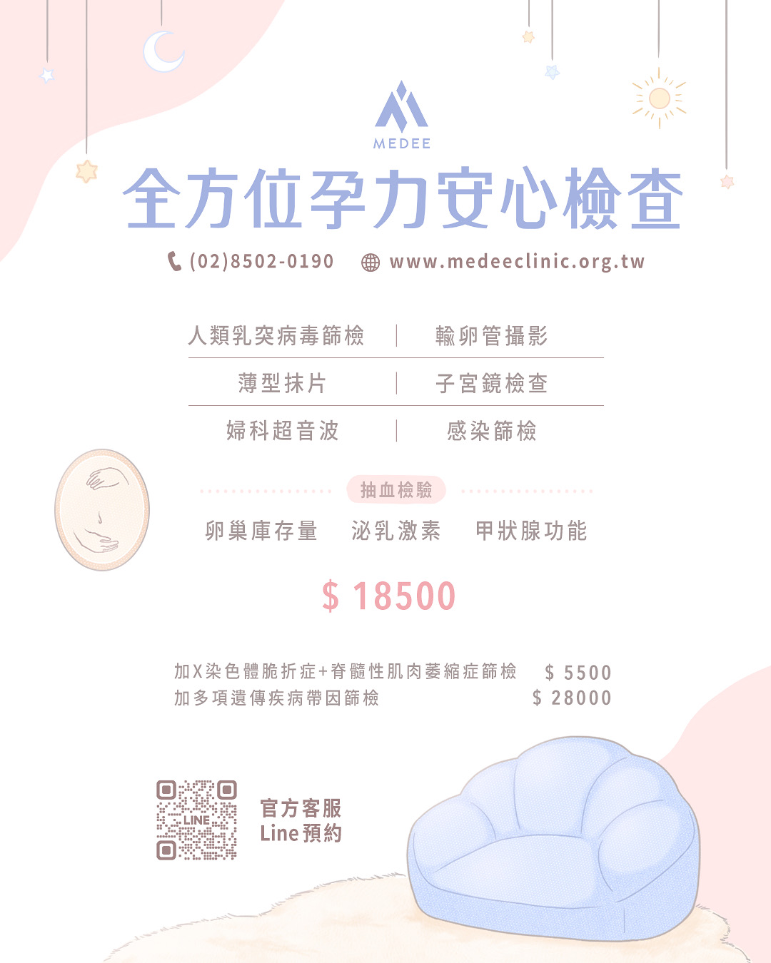 美迪大直婦產科特別設計「全方位孕力安心檢查」,由專業婦產科醫師親自評估,整合超音波、子宮鏡、輸卵管攝影及荷爾蒙抽血等項目,協助你全面了解生育健康狀況,為備孕之路做好準備。